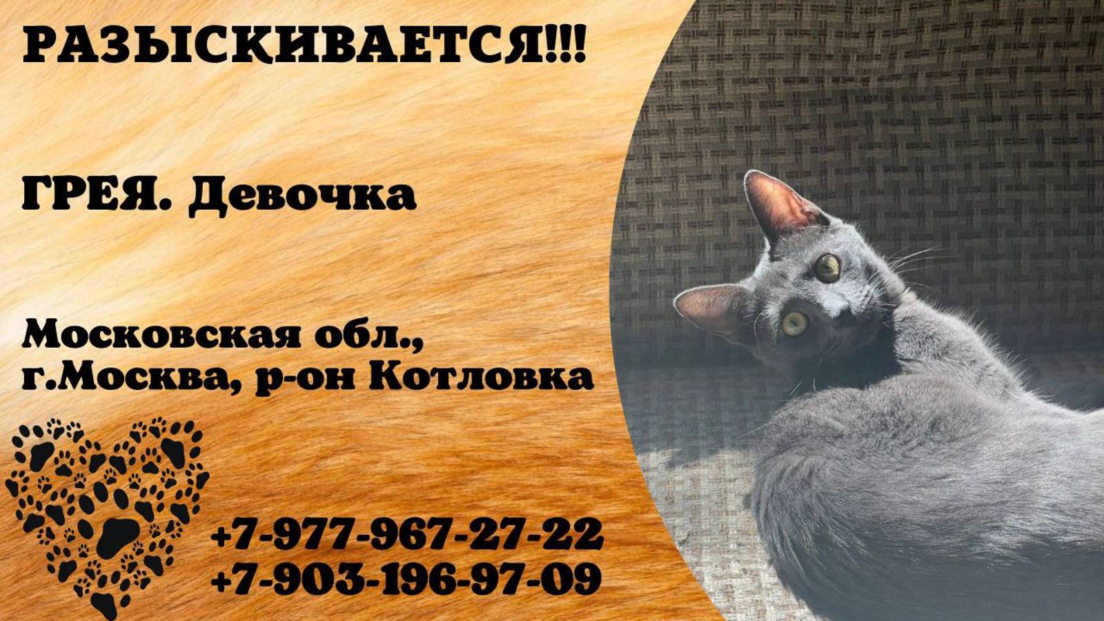Московская Москва, Котловка Пропала кошка 08.08.2024 ПРОПАЛА кошка на ул. Нагорная дом 28 к 1 Кличка Грея, выбежала из квартиры. Прошу вас, если увидели или забрали кошку, позвоните по телефону: +79779672722 Мария или +79031969709 Алина. Гарантирую хорошее вознаграждение!!! Инфо: https://vk.com/wall-198815410_149307 Автор: https://vk.com/id489128588