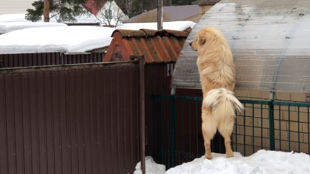 Наш сторож- Боцман! Вот так он охраняет, стоя на задних лапах и смотря поверх забора