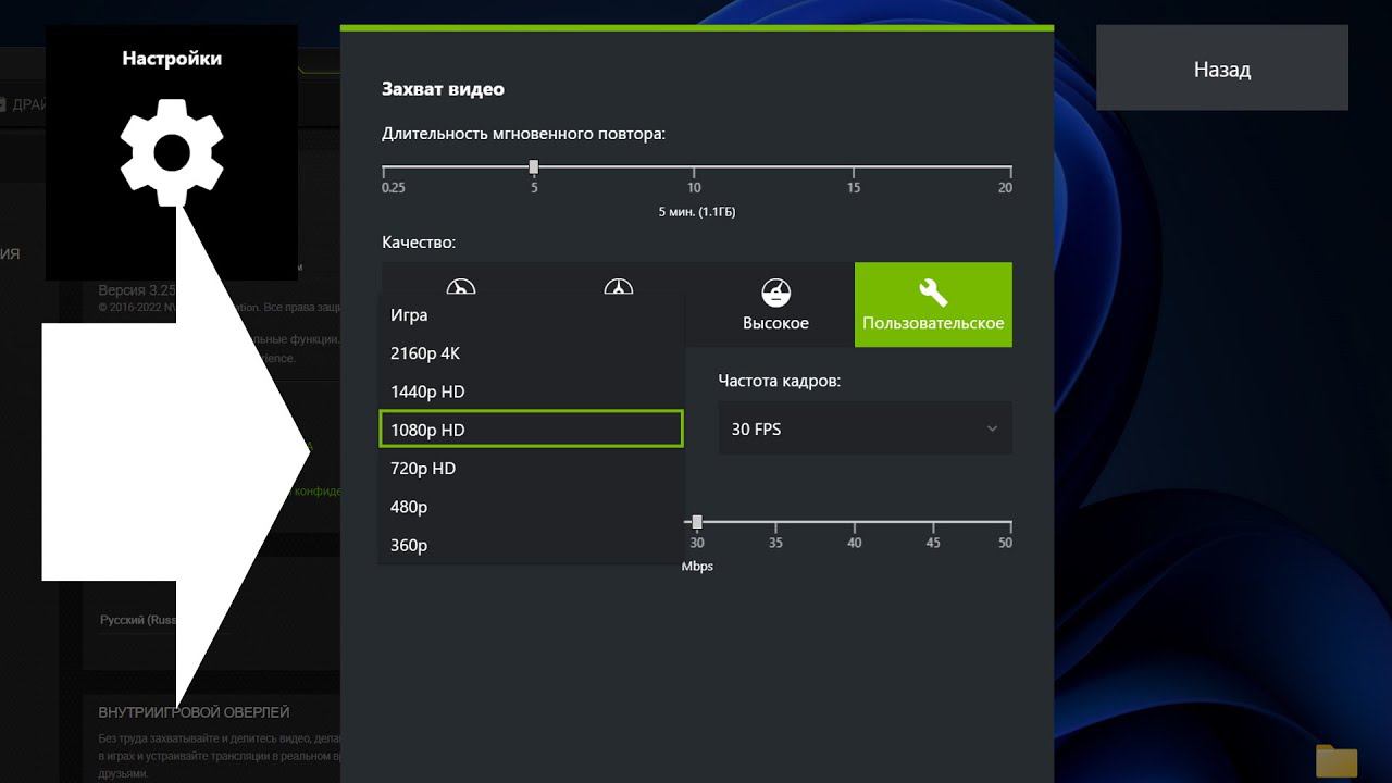 Как поменять разрешение записываемого видео в Geforce Experience ?