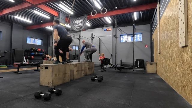 Комплекс 9AMRAP 100 двойных прыжков на скакалке 80 парных бросков мяча 9 кг / 2,7 м (один бросает в цель, второй ловит) 60 кластеров на двоих 35/50 кг (работаем по очереди) 40 швунгов на двоих 35/50 кг 20 подносов ног к турнику 253 (повторения) Комплекс На время: 10-9-8-7-6-5-4-3-2 - Берпи с прыжком на бокс 2-4-6-8-10-8-6-4-2 - Подъем на грудь двух гантелей с виса в стойку (22,5/15 кг) Все синхронно. 10:06 (время)
