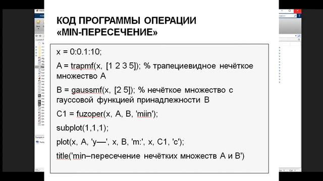 В видео рассмотрена реализация бинарных операций над нечёткими множествами в математическом пакете Matlab. Показана возможность создания m-файла с функцией Fuzoper с последующим вызовом её внутри других программ для определения бинарных операций над нечёткими множествами. Результат выполнения операций представляется в графическом виде, при этом первоначальные нечёткие множества изображены жёлтым и красным цветами, а результирующее нечёткое множество - голубым цветом. Работа выполнена студенткой МГУ им. адм. Г.И. Невельского (г. Владивосток) Шевченко Екатериной Дмитриевной. Приведём фрагмент программы. Для реализации в математическом пакете Matlab бинарной операции «Min-пересечение» двух нечётких множеств A с трапециевидной функцией принадлежности и B с функцией принадлежности гауссовского типа необходимо в области «Command Window» математического пакета Matlab указать следующую совокупность команд: x = 0:0.1:10; A = trapmf(x, [1 2 3 5]); % трапециевидное нечёткое множество A B = gaussmf(x, [2 5]); % нечёткое множество с гауссовой функцией принадлежности В C1 = fuzoper(x, A, B, 'miin'); subplot(1,1,1); plot(x, A, 'y––', x, B, 'm:', x, C1, 'c'); title('min–пересечение нечётких множеств А и В') Видео также опубликовано на Яндекс.Дзен канале "Самостоятельная работа": https://zen.yandex.ru/independent_work/