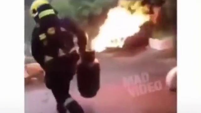 Пожарник выносит горящий балон из здания,чтобы он не взорвался и не принёс жертв с разрушениями