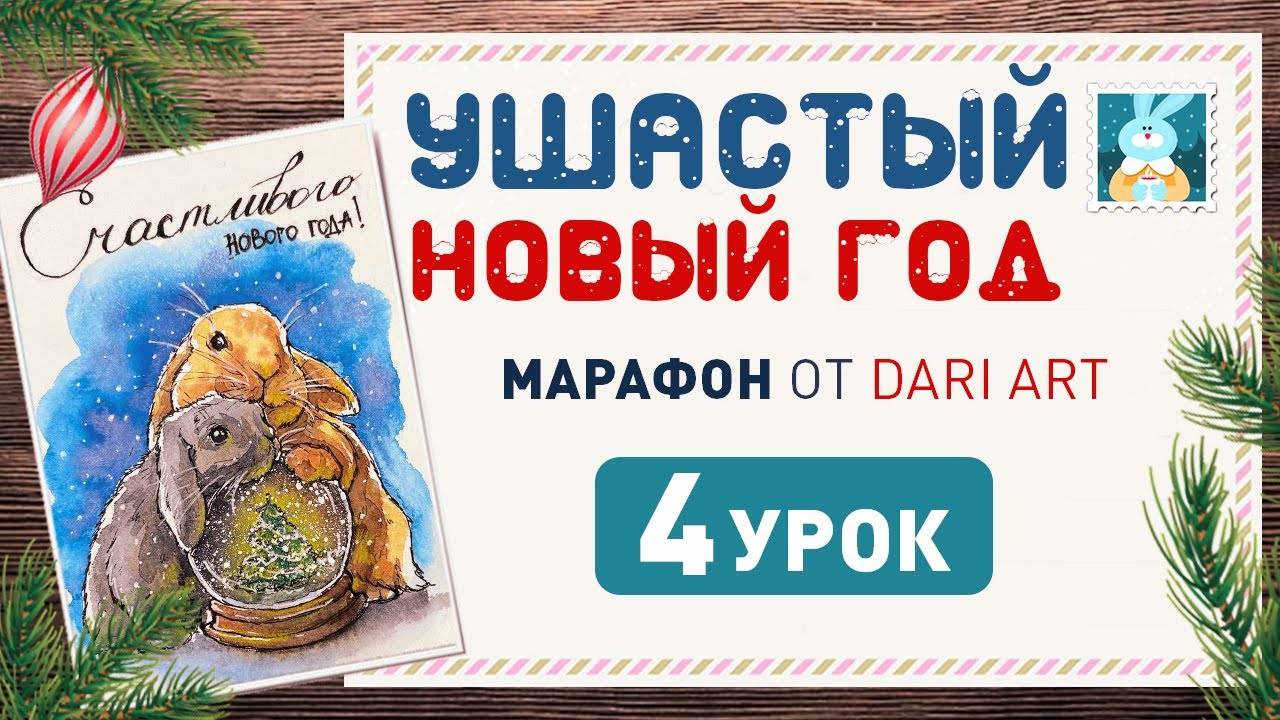 Рисуем акварельную открытку с кроликами и снежным шаром! _Ушастый новый год_ 4 урок.