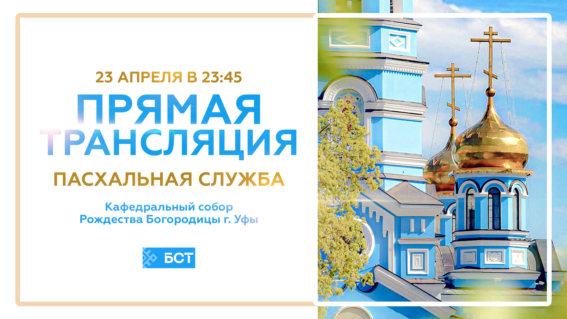 Традиционно Пасху отмечают сразу после Великого поста. Специально для вас мы покажем пасхальную службу из кафедрального собора Рождества Богородицы в Уфе онлайн. Присоединяйтесь к трансляции. Пасха — Светлое Христово Воскресение. Начало: 23 апреля в 23:45.