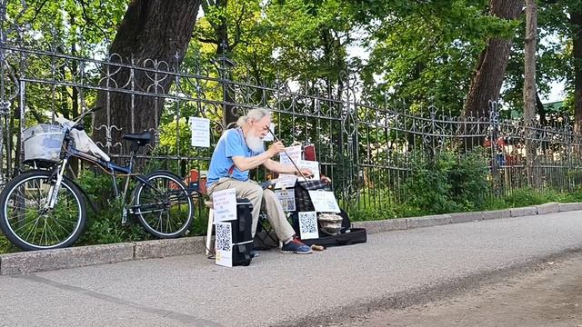 мужик играет на пиле в Петергофе