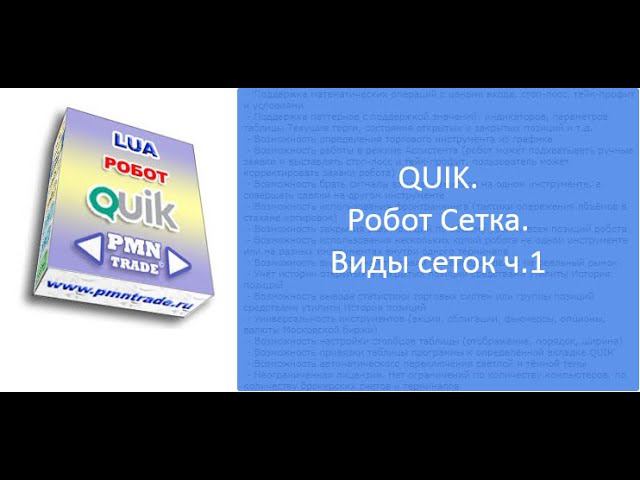 Страница программы: http://pmntrade.ru/robot_setka_lua.html Индикатор "Арбитраж PRO": http://pmntrade.ru/indikator_arbitrage_pro.html 00:00 Начало видео 00:32 ВВЕДЕНИЕ. Виды сеток: - контртрендовая (усреднение, против рынка); - трендовая (пирамидинг, по рынку). Три типа заявок: - лимитные заявки (контртренд); - условные стоп-заявки (тренд); - условные тейк-профит заявки (контртренд). 05:09 Можно применять: - для покупки частями торгового инструмента при падении рынка; - для продажи частями торгового инструмента при росте рынка; - для частичного наращивания позиции; - для хеджирования опционных позиций. 08:50 Ограничения: 1) цена выставления не может быть выше / ниже уровней макс./мин. установленных биржей; 2) заявки не выставляются, если их исполнение будет немедленным. 10:58 Возможность установки цены входа: - явная цена; - по значению индикатора/паттерна/математического выражения. 15:20 Возможность установки стоп-лосс: - от цены фактического входа в позицию; - по значению индикатора/паттерна/математического выражения. 16:46 Возможность установки тейк-профит: - от цены фактического входа в позицию; - по значению индикатора/паттерна/математического выражения. ПРИМЕРЫ. 18:01 - Пример контртрендовой сетки из лимитных заявок. 21:04 - Пример трендовой сетки из условных стоп-заявок. 24:15 - Пример контртрендовой сетки из условных тейк-профит заявок. 27:15 - Пример с центром сетки на основе индикатора «Скользящая средняя». 29:48 - Пример с центром сетки на основе центральной линии сложного индикатора «Price Channel». 34:40 - Пример с быстрой перестановкой центра сетки при помощи индикатора «Арбитраж PRO». 38:18 - Пример с добавлением уровней в сетку.