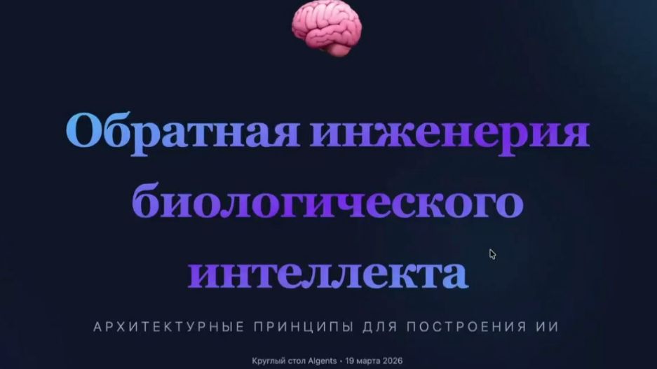 Обратная инженерия сложного поведения биологических систем для построения искусственного интеллекта - круглый стол - Михаил Киселёв, Евгений Витяев, Галина Бессонова, Владимир Смолин, Игорь Пивоваров, Александр Болдачев Семинар русскоязычного сообщества AGI 19 марта 2026 17:00 мск - Какие принципы биологического интеллекта мы уже используем в искусственном и как именно? - Какие ещё не используем, но должны и почему? - Какие не должны и почему? Смотрим видео в ВК https://vk.com/video/@agirussia на RUTUBE https://rutube.ru/channel/24279932/ и на YouTube https://www.youtube.com/siberai Мы ведем группы и организуем семинары русскоязычного сообщества разработчиков систем AGI (Artificial General Intelligence или Общий Искусственный Интеллект) или Strong AI (Сильный Искусственный Интеллект), а также - являющийся их частным случаем HLAI (Human-Level Artificial Intelligence или Искусственный Интеллект Человеческого Уровня). https://agirussia.org/ Группы: https://t.me/agirussianews (новостной канал) https://t.me/agirussia (основная) https://t.me/agitopics (различные темы по группам) https://t.me/agibots (разговорный интеллект) https://t.me/agifintech (финансовые технологии) https://t.me/collectivei (коллективный интеллект) https://vk.com/agirussia (основная) https://www.facebook.com/groups/agirussia (основная) https://www.facebook.com/groups/socialintelligence (коллективный интеллект) https://groups.google.com/g/agirussia (рассылка) Онлайн-семинары идут по средам или четвергам, в 17:00 или 18:00 по Московскому времени. Продолжительность два часа, обычно это либо доклад на один-полтора часа и последующее обсуждение на полчаса-час либо круглый стол с регламентом на усмотрение модератора дискуссии. Технические средства проведения, регламент и модерацию обычно обеспечивает инициатор конкретного семинара либо спикер и его коллеги. Регистрация на семинары (внизу страницы): https://aigents.timepad.ru/event/1412596