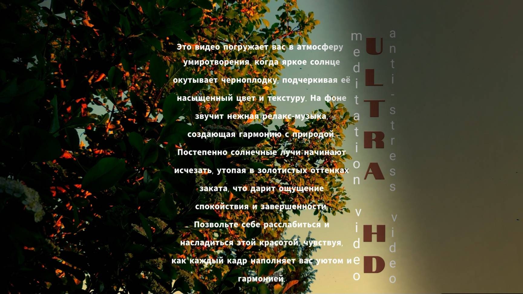 Это видео погружает вас в атмосферу умиротворения, когда яркое солнце освещает природу, смешивая насыщенные цвета и текстуры. На фоне звучит нежная релакс-музыка, создающая гармонию с миром окружающего. Проходящие солнечные лучи начинают исчезать, утопая в золотых лучах заката, что дарит ощущение спокойствия и завершенности. позволяю себе расслабиться и насладиться этим бытием, чувствуя, как каждый кадр наполняет вас уютом и гармонией. Дзен канал https://dzen.ru/id/6749839d1a26d92e9e16311a?share_to=link Ютуб канал https://www.youtube.com/channel/UCxzB32_02Y1l1kYI8J_lxZw Почта для сотрудничества RVPSAR@yandex.ru