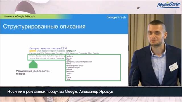 С новинками рекламных продуктов Google знакомит Александр Ярощук, директор по развитию MediaGuru. Бизнес-встреча для интернет-маркетологов Google.Fresh Смотрите запись целиком: https://www.youtube.com/watch?v=GiSZ2yvHtnw ===== Наш сайт: https://mediaguru.ru/ Подпишитесь на нас в соцсетях, чтобы узнавать последние новости интернет-рекламы! Вконтакте: https://vk.com/mediaguruagency Facebook: https://www.facebook.com/MediaGuru.ru Twitter: https://twitter.com/MediaguruAgency