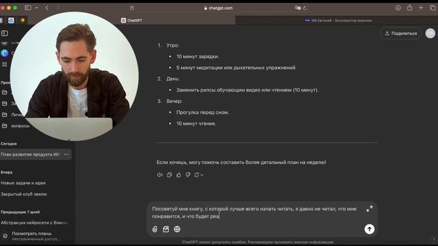 В этом видео я покажу, как использовать ChatGPT для работы с привычками — от избавления от вредных до внедрения полезных. Вы узнаете, как формулировать запросы так, чтобы получать чёткие и реализуемые рекомендации, а также создавать пошаговый план изменений. Примеры запросов: 📌 Замена вредных привычек "Я хочу перестать перекусывать сладким после ужина, так как это мешает поддерживать форму. Какие шаги помогут заменить эту привычку на что-то полезное? Например, на вечерний чай или прогулку. Составь пошаговый план и предложи альтернативные способы." 📌 Как внедрить спорт в жизнь "Я постоянно откладываю занятия спортом. Вместо этого смотрю сериалы по вечерам. Помоги разработать простой план, чтобы начать с малого: 10-15 минут зарядки утром или вечером. Какие упражнения лучше выбрать? Как избавиться от привычки откладывать?" 📌 Как избавиться от залипания в рилсы "Я часто залипаю в рилсы после ужина и трачу на это по часу или больше. Какие шаги помогут мне избавиться от этой привычки? Подскажи, что можно делать вместо этого, чтобы начать читать книги перед сном." 👉 Продолжайте обучение и прокачивайте навыки работы с ИИ! 🔹 Бесплатные видео в Telegram @genn_AI_Bot 🔹 Канал о нейросетях @genn_ai 🔹 Сообщество "Вместе с ИИ" @ Подписывайтесь, ставьте лайк и пишите в комментариях, если у вас есть вопросы!