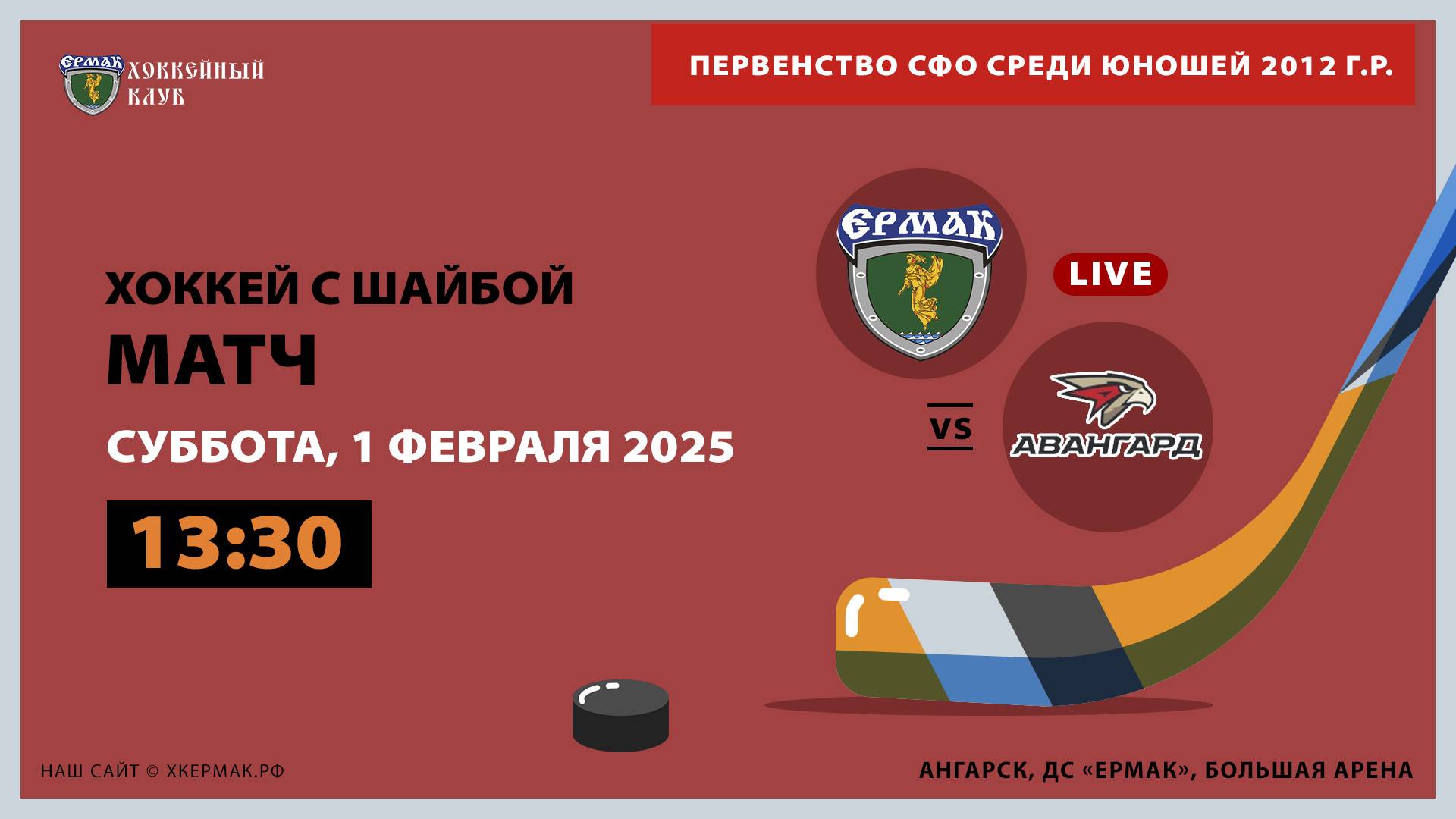 Первенство России по хоккею с шайбой среди юношей 2012 г.р. , дивизион «Сибирь - Дальний Восток». Матч между командами «Ермак» (Ангарск, Иркутская область) и «Авангард-2» (Омск) в Ангарске. 1 февраля 2025 г., г. Ангарск, большая арена ДС «Ермак»