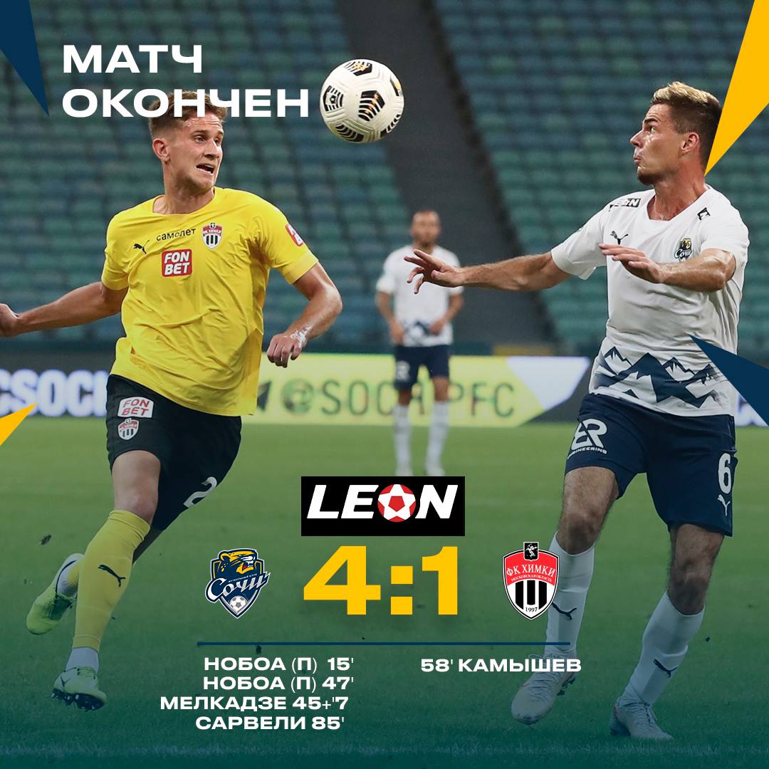 В матче седьмого тура встречались Сочи и Химки. В последнее время Химки неудачно играют после смены тренера. А Сочи тоже ищут свою игру в новом сезоне. Сочи вышли заряженными на игру. А Химки пока очень слабо играют. После первого тайма Сочи выигрывали со счётом 3:0. В матче было три пенальти. Два реализовал Нобоа. Так же забили Мелкадзе и Сарвелия. Вообщем удачная игра для Сочи. Болельщиков Сочи с победой. Благодарю за просмотр.