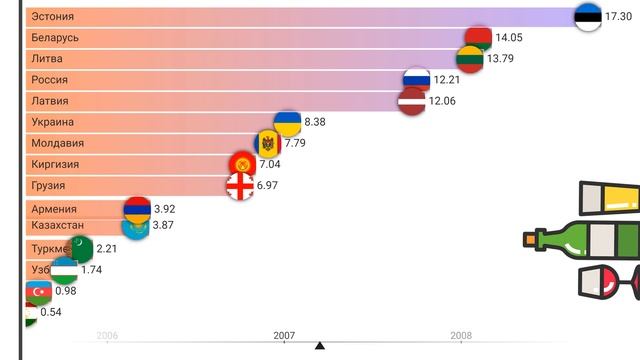 #инфографика #статистика #ссср Потребление всех типов алкоголя на душу населения в литрах Зарегистрированное потребление алкоголя на душу населения 15+ Понравилось видео?ставим лайк и подписываемся на канал!💗 Источник : https://www.who.int// Видео сделано с помощью сервиса https://livingcharts.com смотреть на дзен https://dzen.ru/video/watch/635e1cd763d470784989cdd3 Потребление алкоголя на душу населения.Рейтинг стран СССР.Статистика.В какой стране больше пьют?