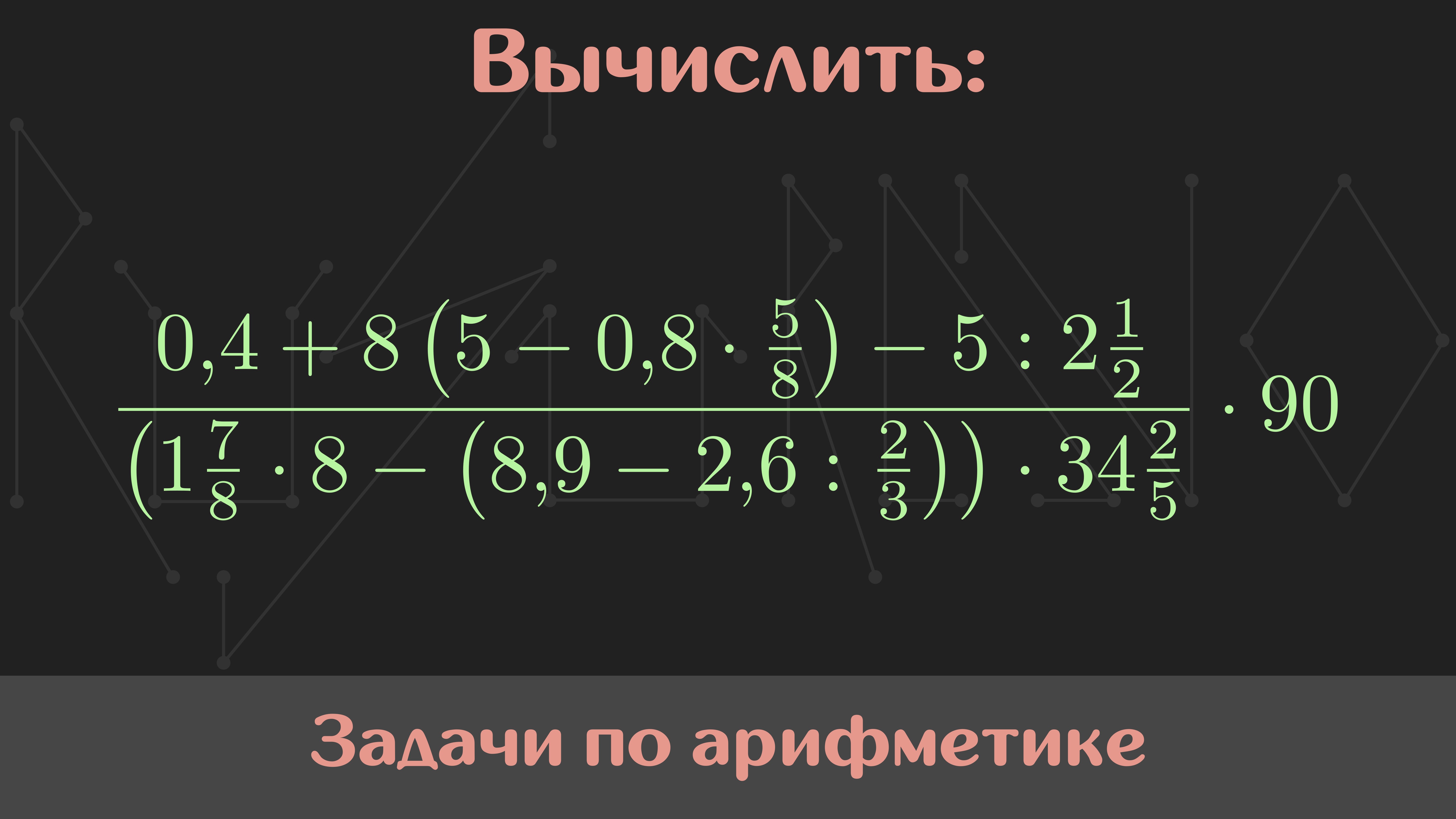 Мой курс по арифметике: https://stepik.org/a/195543 Условие: Вычислить (0.4 + 8(5 - 0.8 * 5/8) - 5 : 2[1/2]) / ((1[7/8] * 8 - (8.9 - 2.6 : 2/3)) * 34[2/5]) * 90 Памятка: перед просмотром решения задания обязательно попробуйте решить задачу самостоятельно. Так вы научитесь вырабатывать собственный подход к решению. Музыка: Nomyn — Moonlight #Сканави #Арифметика #РешайСоМной #Математика