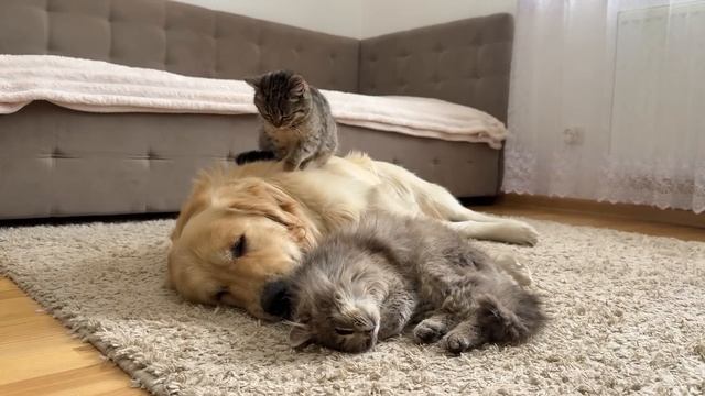 Котята считают, что их золотистый ретривер — лучшая кровать в мире! - 2025 год