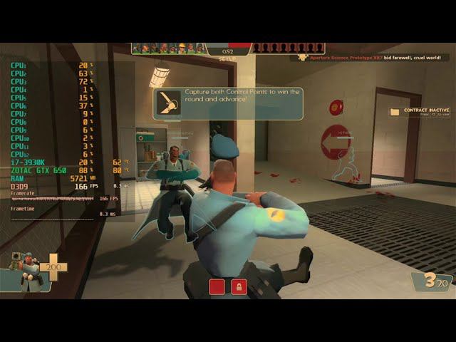 Game: Team Fortress 2 Сomputer characteristics: Socket: LGA 2011 Motherboard: Asus Sabertooth X79 Processor: i7 3930K 3.20GHZ RAM: HYPER X 16GB DDR3-DIMM 1600 GPU: ZOTAC GTX 650 GDDR5 2GB ROM: SSD 128GB+HDD 500GB Video in 1920x1080 resolution. Operating system: Windows 10 Pro