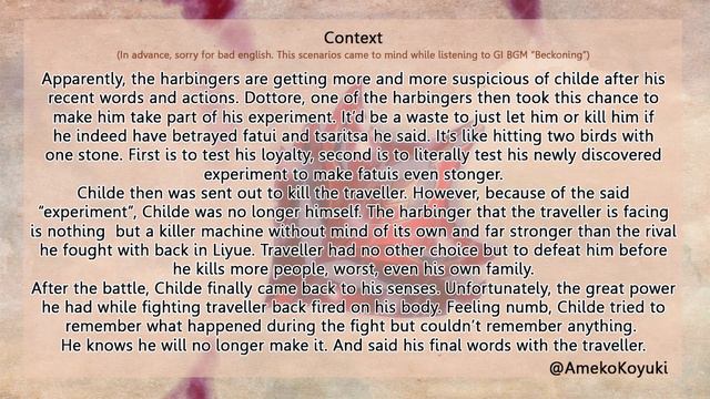 "Staying Together one last time at a Snowing Day" I hope you enjoy this funny comic, special thanks To Ameko Koyuki for giving me Permission to dub this Lovely yet Sad Comic TwT Comic, Please do check them out ^w^/ Credits Comic: Sources by https://mobile.twitter.com/AmekoKoyuki Artist: Ameko Koyuki @AmekoKoyuki ×Comic: https://mobile.twitter.com/amekokoyuki/status/1352063907335032833 ×Song: Invoke_-_The_Pulse_of_Affection ×Song: Beckoning_(Genshin_Impact_Main_Theme_Var.) ×Song: Demon_Slayer_Movie_OST__Rengoku's_Last_Smile_(Sad_Theme) ×Song: [Honkai Impact 3] - Starfall by TIA RAY (Meteoric Salvation OST) Edited by Larabi Animo ヾ(〃^∇^)ノ Ending Credits: LarabiStudio End Credit video game: Vrchat Lumine: @xXS_SwordXx O(≧▽≦)O https://www.youtube.com/channel/UC91LsXQ-G3r8ukLazu9mniA https://twitter.com/xXS_SwordXx Childe :GaleTheVO (●´ω`●) https://twitter.com/GaleTheVO Narrator : AureoVA https://twitter.com/Aureo00?s=09
