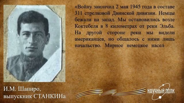 В преддверии Дня Победы мы вспоминаем истории мужества и героизма наших предков, сражавшихся на фронтах Великой Отечественной войны. Среди них – выпускник СТАНКИНа - И.М. Шапиро. Мы помним и гордимся! #80летПобеде #научныйполк