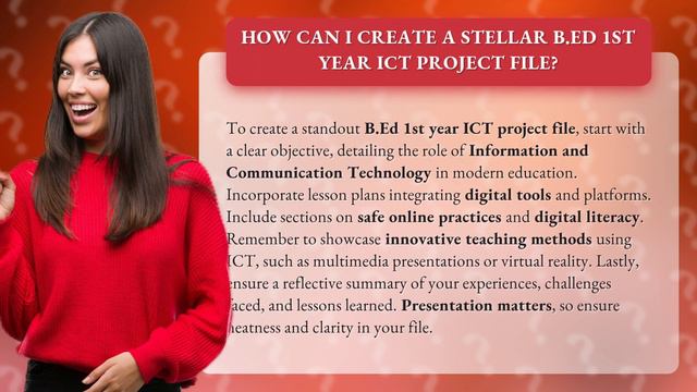 Creating an Outstanding B.Ed 1st Year ICT Project File • Outstanding B.Ed ICT Project • Learn how to create a stellar B.Ed 1st year ICT project file that stands out from the rest. Discover the key elements to include, such as clear objectives, lesson plans with digital tools, safe online practices, and innovative teaching methods. Don't forget to reflect on your experiences and showcase your neat and clear presentation skills.