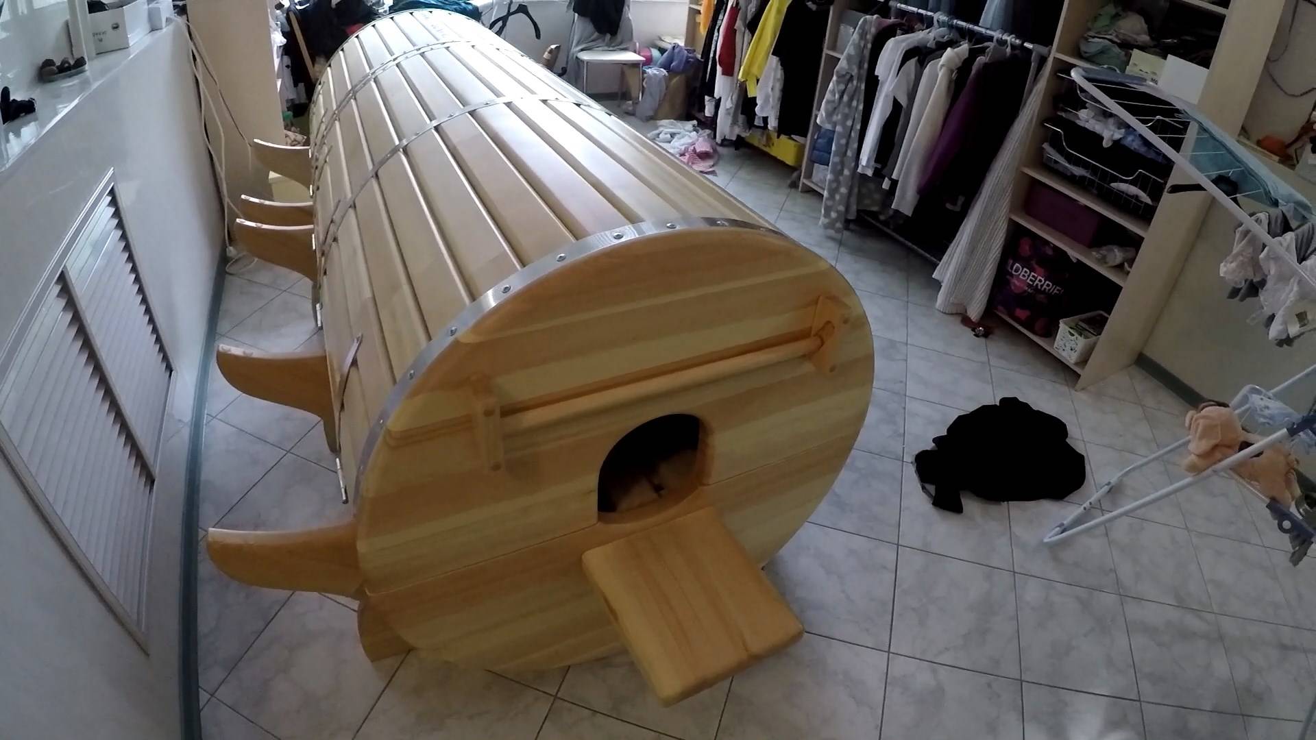 Кедровая горизонтальная (SPA-капсула) фитобочка Две крышки. Материал - кедр сорта ЭКСТРА. Наружное покрытие - лак Внутреннее покрытие - нет. Примененные опции: 1. Фиксатор для полотенца Отличия и преимущества фитобочки СПА-капсула перед горизонтальными (лежачими) моделями других производителей - 1. Имеются две открывающиеся крышки, а не только одна, как у других. Две открытые крышки дают возможность легко и комфортно лечь в бочку людям с большим весом и ограниченной подвижностью суставов. 2. Имеется опция регулируемого по высоте подголовника - https://kinescope.io/tjPcbR9bccBboUs7Q2ktgU Это дает возможность подложить под голову любую подкладку/полотенце/подушку. Это очень важно для людей с проблемами в шейно-грудном отделе позвоночника. 3. Имеется опция фиксатора полотенца - https://kinescope.io/cg2qt69eAwdkbMBRdYL2at Никто из других производителей не делает эту опцию (как и регулируемый подголовник). А напрасно. При положении лежа очень трудно закрыть горловину фитобочки во время процедуры так, чтобы полотенце и перекрывало выход пара наружу, и не давило на шею человека. Наш фиксатор полотенца был разработан именно с этими целями. Он позволяет быстро закрепить полотенце так, что оно блокирует выход пара наружу и при этом не давит на шею. Больше фото и видео, техническое описание, актуальную цену этой модели, отзывы, кнопка заказа здесь https://www.fitosauna.ru/katalog/kedrovye-fitobochki/tolstostennaya-gorizontalnaya-spa-kapsula Модель / номер / клиент: Гориз / 1487 / Белов