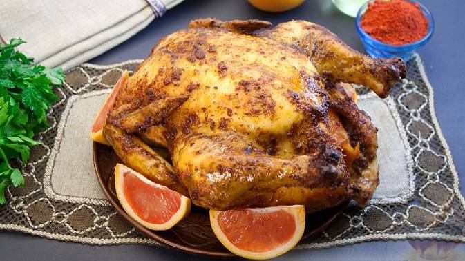 Птица с сюрпризом. КУРИЦА, ЗАПЕЧЁННАЯ С ГРЕЙПФРУТОМ И ПАПРИКОЙ