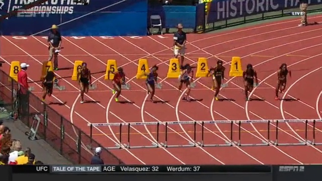 Women 100 Meter Hurdles (Final) 1 Kendra Harrison SR Kentucky 12.55 +1.7 1 (1) 2 Cindy Ofili JR Michigan 12.60 +1.7 1 (2) 3 Dior Hall FR USC 12.74 +1.7 1 (3) 4 Jade Barber SR Notre Dame 12.85 +1.7 1 (4) 5 Bridgette Owens SR Florida 12.86 +1.7 1 (5) 6 Chanice Chase JR LSU 12.95 +1.7 1 (6) 7 Devynne Charlton SO Purdue 13.00 +1.7 1 (7) 8 Daeshon Gordon FR LSU 13.29 +1.7 1 (8)