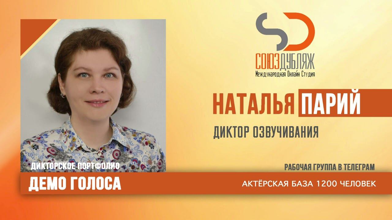 #СоюзДубляж #БазаДикторов #Озвучка ✔️Наталья Парий, диктор озвучивания. Международная Онлайн-Студия "СОЮЗДУБЛЯЖ" - профессиональная озвучка и дубляж. ▪️Рабочая группа в Телеграм: https://t.me/soyuzdubliazh ▪️Контакт для связи: https://t.me/SoyuzAdmin ▪️Подпишись:https://www.youtube.com/c/SOYUZDUBLIAZH ▪️Сайт: https://www.soyuzdubliazh.com/ Лучшие голоса для вашей аудиорекламы и видеороликов. База дикторов - 5 000 человек, профессионального уровня на ENG| FR| TR| RU| ISR| AZ| UA| KZ| UZ| языках. Мужские и Женские топовые голоса для озвучки любых проектов, таких как: Рекламы, Презентации, Фильмы, Сериалы, Игры, Мультфильмы, ТВ Шоу, Аудио-видео визитки. ✔️Сотрудничая с нами вы получаете свой проект под ключ, не выходя из дома или офиса. Наша слаженная команда из лучших дикторов, актёров озвучивания, режиссёров и звукорежиссёров в кратчайшие сроки озвучат или отдублируют ваш заказ на профессиональном уровне. Образцы работ нашего портфолио вы сможете посмотреть на канале СОЮЗДУБЛЯЖ. ВНИМАНИЕ: ✔️Мы приглашаем специалистов озвучки к сотрудничеству в нашей команде. Вы можете пройти по ссылке в наш телеграм канал и связаться с Админом для обсуждения. ✔️Всем заказчикам подобных медиа проектов по озвучки и дубляжу фильмов, сериалов, документалок обращаться непосредственно к Админу Телеграм группы СОЮЗДУБЛЯЖ, пройдя по ссылке: Проходи по ссылке: https://t.me/soyuzdubliazh International Online-Studio SOYUZDUDLIAZH presents a highly professional approach in voice-over and dubbing. ▪️Our working group https://t.me/soyuzdubliazh ▪️Chief manager https://t.me/SoyuzAdmin ▪️Follow https://www.youtube.com/c/SOYUZDUDLIAZH ▪️Web: https://www.soyuzdubliazh.com/ We offer You the best Voices for your Audio commercials and Video`s. Our Database contains over 5 000 voices of native speakers and high-class foreign language specialists in ENG| FR| TR| RU| ISR| AZ| UA| KZ| UZ|. Male & Female top level voices for all the variety of dubbing projects such as commercials, presentations, movies, TV-series, video and computer games, cartoons, TV-shows, audio & video portfolio’s – all in one place. As your business partner we guarantee a turn-key project without you leaving your house or office. Our target is to make sure that the dubbing of your project is made as quick as possible by a well-coordinated and professional team of the best speakers, film and sound directors. To whom it may concern! We invite dubbing specialists to join our team. Please contact our manager on Telegram https://t.me/soyuzdubliazh