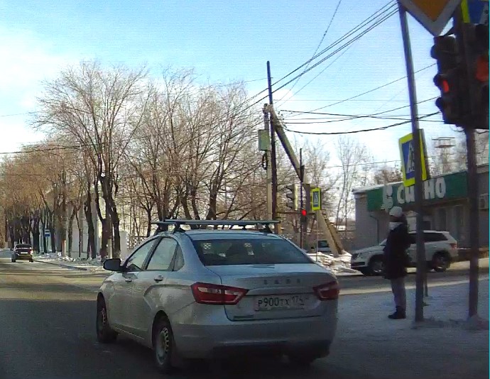 Пересечение стоп-линии и выезд на перекрёсток на запрещающий движение сигнал светофора. Госномер нарушителя Р900ТХ 174 LADA (ВАЗ) Vesta 2017 г.в., серебристый. Перекрёсток ул. Чкалова и ул. Вайнера. 30-01-2022 (Внимание! Эпизод записан 30.01.2022! Регистратор показывает ошибочную дату. Приношу извинения за невнимательность.) п. 6.16 ПДД Дорожный знак "Стоп-линия". Место остановки транспортных средств при запрещающем сигнале светофора. п. 6.2. ПДД - жёлтый сигнал запрещает движение, красный сигнал запрещает движение, зелёный сигнал разрешает движение. п. 6.13 ПДД - при запрещающем сигнале светофора... водители должны остановиться перед стоп-линией (знаком 6.16).