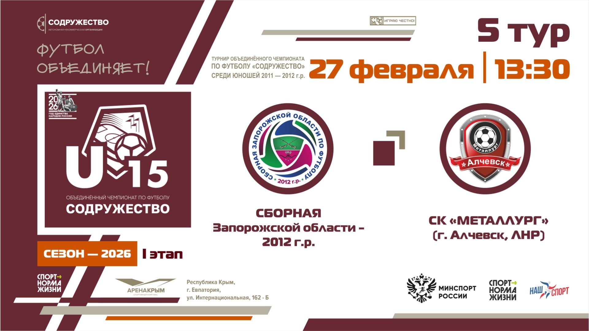 5 ТУР | U-15 | Сборная Запорожской области 2012 - СК «Металлург» (г. Алчевск, ЛНР) | 27.02.2026 | 13
