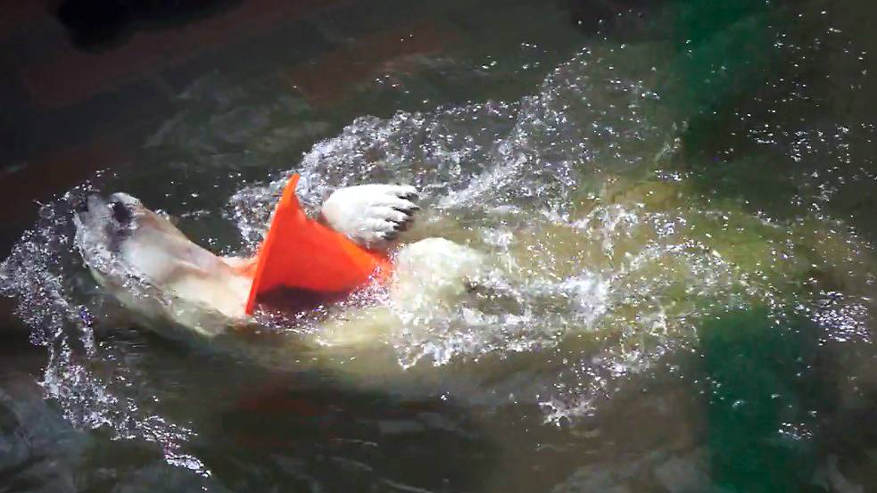 Медвежата Белка и Стрелка дружно плавают в бассейне, развлекаясь с игрушками.