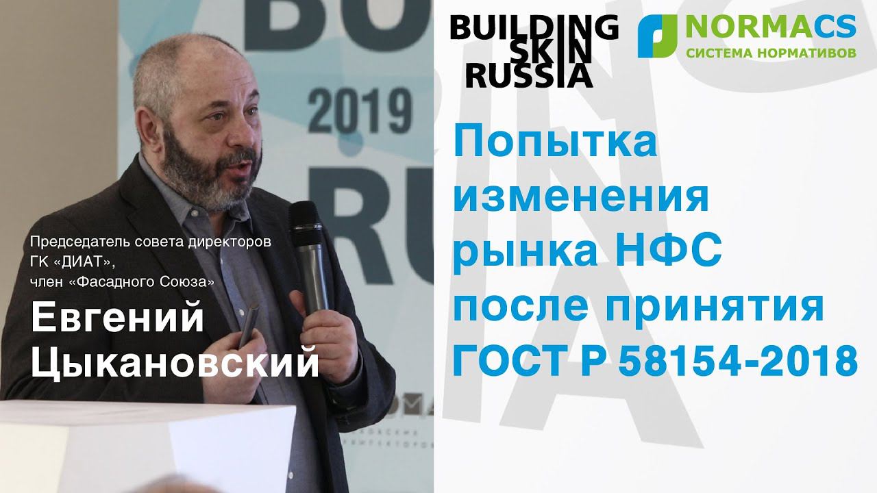 Евгений Цыкановский, председатель совета директоров ГК «ДИАТ», член «Фасадного Союза». Доклад на Building Skin Russia 2019: "Попытка изменения рынка навесных фасадных систем (НФС) после принятия ГОСТ Р 58154-2018 "Материалы подконструкций навесных вентилируемых фасадных систем. Общие технические требования". www.normacs.info