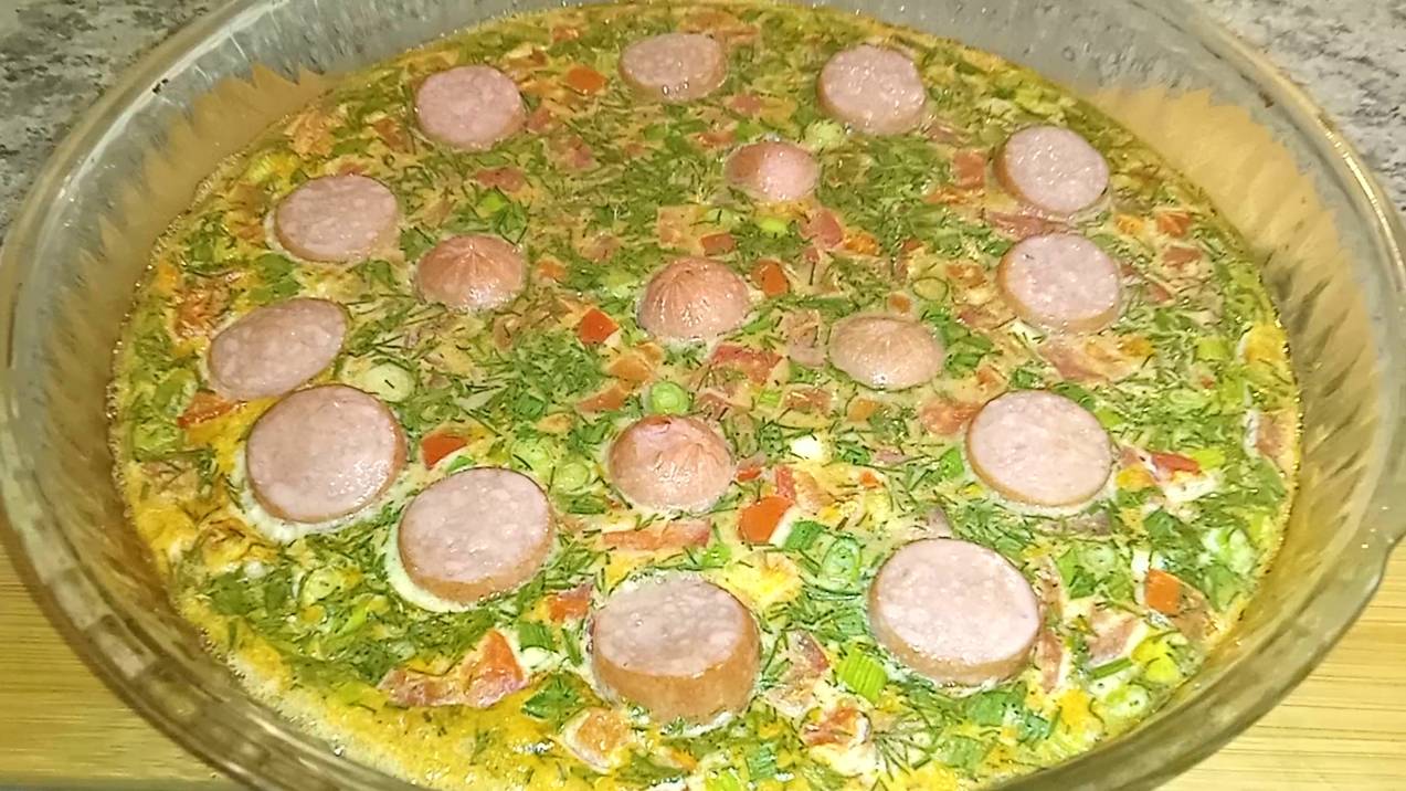 Омлет с помидорами, зеленью, творожным сыром, сметаной, сосисками и специями на сливочном масле.