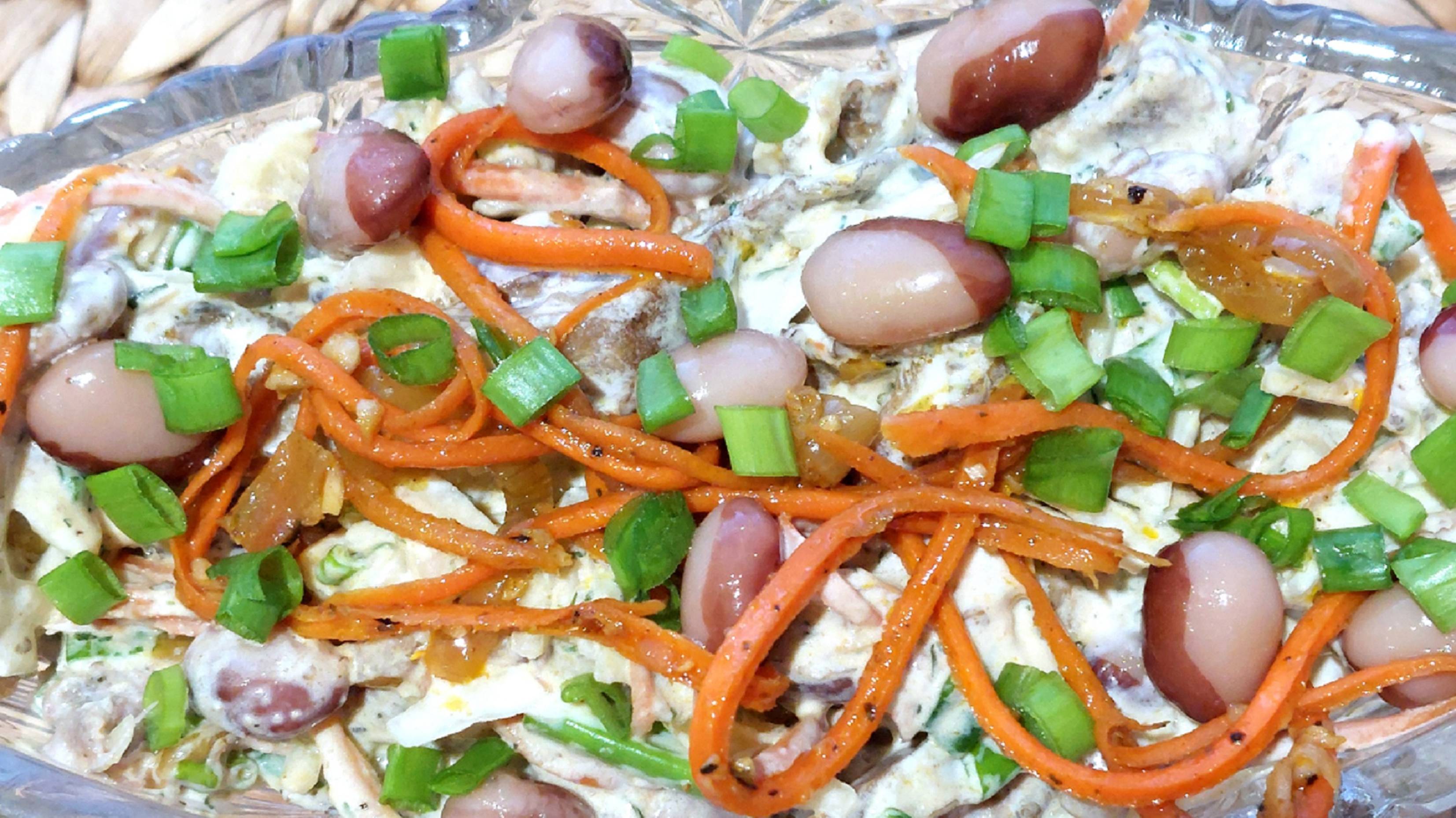 Салат играет разными вкусовыми красками Сочетание ингредиентов придают гармоничный вкус и аромат. Ссылка на видео "Салат морковный на корейский манер: https://rutube.ru/video/private/10905cda9e34407721e435d859 ИНГРЕДИЕНТЫ: Для приготовления капусты: • Капуста – 300 гр • Соль – 1 чл • Сахар – 1 десл • Уксус 9% - 1 чл • Зелень укропа – 6 гр Основа салата: • Морковь по - корейски – 4 стл • Капуста – 4 стл • Фасоль отваренная– 4 стл • Язык – 0,5 шт • Рыжики – 6 стл • Зелёный лук – 1 шт • Майонез – 2 стл Подсолить заранее. свежую капусту с укропом или нашинковать свежей. Зелёный лук нарезать кружочками, язык кубиками. Все остальные ингредиенты готовы к применению. В чашке соединить все ингредиенты, заправить майонезом, перемешать, переложить в салатник. Оформить на своё усмотрение. ПРИЯТНОГО АППЕТИТА!!! Всем мира, бодрости духа и благополучия.