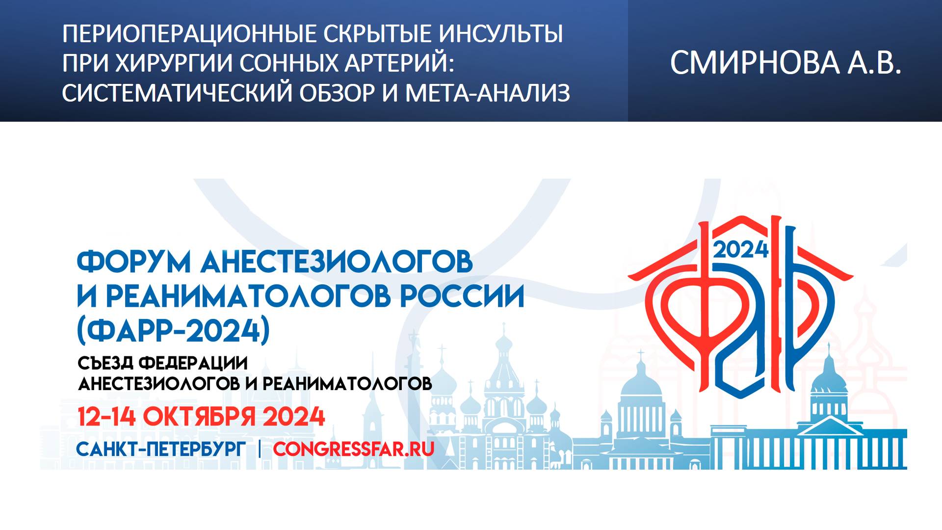 Видеозапись ФАРР-2024, XXII съезд Федерации анестезиологов и реаниматологов 12-14 октября 2024, Санкт-Петербург. Анастасия Владимировна Смирнова "Периоперационные скрытые инсульты при хирургии сонных артерий:систематический обзор и мета-анализ" Информация, размещенная на канале, предназначена исключительно для медицинских специалистов