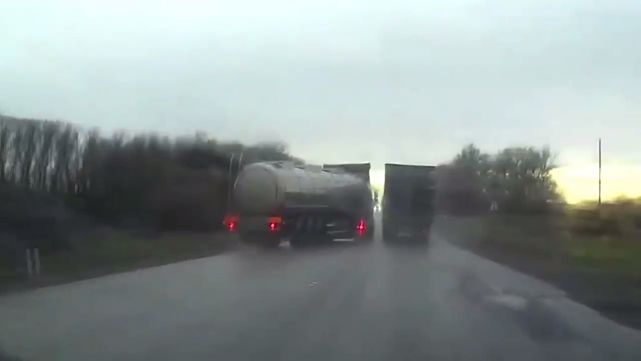Из-за неправильного обгонного маневра на мокрой трассе бензовоз начало заносить на встречке, что чуть не стало причиной крупной аварии. #занос#встречка#дождь