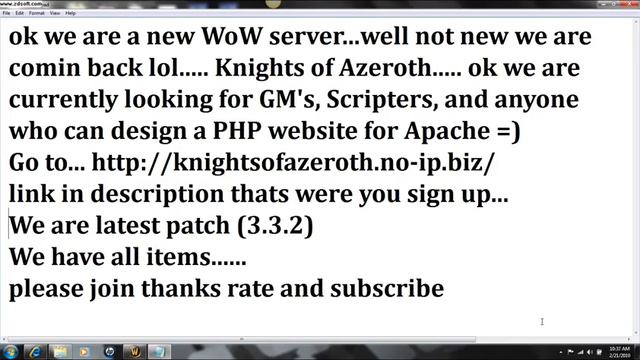 join vent to talk to me Hostname/IP knightofazeroth.no-ip.biz port: 3784 ok we are a new WoW server...well not new we are comin back lol..... Knights of Azeroth..... ok we are currently looking for GM's, Scripters, and anyone who can design a PHP website for Apache =) Go to... http://knightsofazeroth.no-ip.biz/ thats were you sign up... We are latest patch (3.3.2) We have all items...... please join thanks rate and subscribe