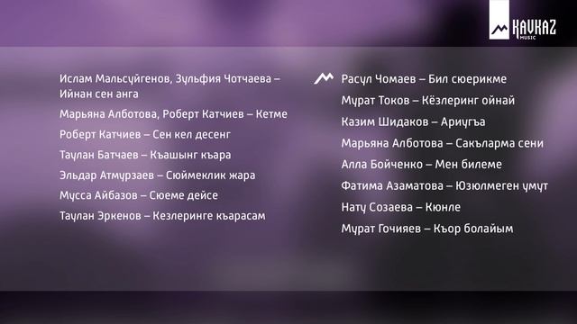 Сборник Карачаево-Балкарской музыки - Къарачай-Малкъар сюймеклик джырла 01 Ислам Мальсуйгенов, Зульфия Чотчаева Ийнан сен анга (Поверь ты этому всему) карач Марьям Хабова Марьям Хабова 02 Марьяна Алботова, Роберт Катчиев Кетме (Не уходи) карач Касбот Тамбиев Касбот Тамбиев 03 Роберт Катчиев Сен кел десенг кар-балк Къасбот Тамбиев Хусей Джаубаев 04 Таулан Батчаев Къашынг къара каб Раиса Токумаева Раиса Токумаева 05 Эльдар Атмурзаев Сюймеклик жара (Любовная рана) балк Мамаева Фатима Мечиев Кязим 06 Мусса Айбазов Сюеме дейсе (Говоришь «люблю») карач Борис Эркенов Борис Эркенов 07 Таулан Эркенов Кезлеринге къарасам (Когда смотрю в твои глаза) карач Борис Эркенов Борис Эркенов 08 Расул Чомаев Бил сюерикме (Знай буду любить) карач Расул Чомаев Расул Чомаев 09 Мурат Токов Кёзлеринг ойнай (Игривые глаза) карач О.Отаров О.Отаров 10 Казим Шидаков Ариугъа (Для красивой) карач Мурат Гочияев Мурат Гочияев 11 Марьяна Алботова Сакъларма сени (Буду ждать тебя) карач Любовь Болурова Медиха Шаманова 12 Алла Бойченко Мен билеме (Я знаю) балк Мустафир Жеттеев Ибрагим Маммеев 13 Фатима Азаматова Юзюлмеген умут (Надежда) карач Фатима Азаматова Тамара Батчаева 14 Нату Созаева Кюнле балк Нату Созаева Лейла Атаева 15 Мурат Гочияев Къор болайым (Благодарю) карач Тамара Уртенова Байдымат Кечерукова KAVKAZ MUSIC объединяет и транслирует этническую музыку народов Кавказа. Подписывайся: YouTube: https://youtube.com/kavkazmusictv ВКонтакте: https://vk.com/kavkazmusictv Одноклассники: https://www.ok.ru/kavkazmusictv #KavkazMusic #КавказскаяМузыка #МузыкаКавказа