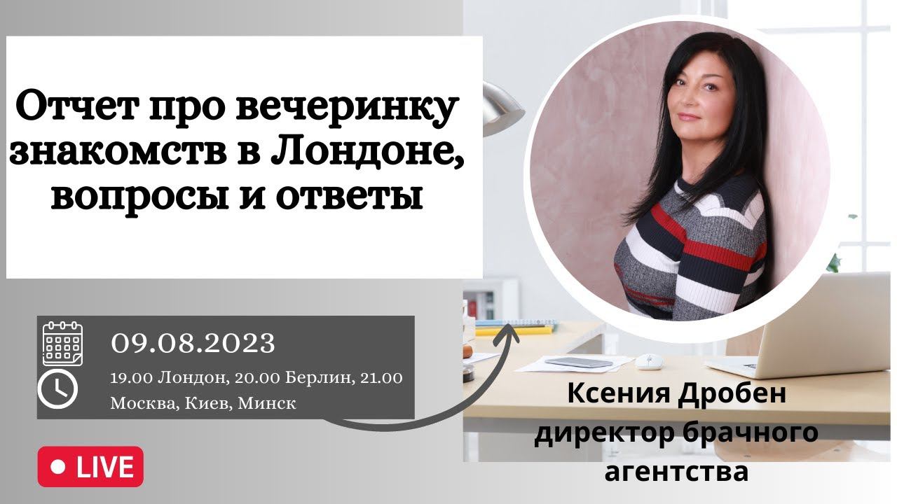 Сегодня у нас среда – время девочкиного вебинара. Сегодняшние темы: разборы ваших ситуаций и отчет про вчерашнюю вечеринку в Лондоне Мы встречаемся сегодня, в среду 9 августа Время: 19.00 по Лондону, 20.00 по Берлину, 21.00 по Минску, Киеву и Москве Вебинар пройдет одновременно на нескольких платформах. Если вы не сможете присутствовать лично, то можно будет посмотреть в записи Место встречи: нашем каналеYouTube Ksenia Droben https://www.youtube.com/@KseniaDrobenPartnervermittlung На странице Facebook https://www.facebook.com/ksenia.droben VK https://vk.com/kseniadroben Tiktok @kseniadrobendating INSTA: @kseniadroben Буду рада увидеться с вами Если вы не смогли принять участие в «Круглом столе», обязательно посмотрите. Картинка записалась криво, но можете на меня и не смотреть. Главное, это вопросы и ответы мужчин: https://www.youtube.com/live/sga4B-AXjyA?feature=share Наши ближайшие мероприятия: 18-20 августа – вечеринки знакомств в Санкт-Петербурге https://droben-partnervermittlung.de/ru/single-dating-party-petersburg/ 19 августа – презентация в честь 25-летия брачного агентства (Санкт-Петербург) 16 сентября – вечеринка знакомств в Кельне https://droben-partnervermittlung.de/ru/single-dating-party-germany-2/ Если получение наших рассылок больше не актуально для Вас, напишите нам, пожалуйста, на мейл info@droben-partnervermittlung.de и мы удалим Ваш мейл из новостной рассылки С уважением Международное брачное агентство Ксении Дробен “VIP-International“ www.bridespb.com www.droben-partnervermittlung.de/ru Whatsapp +4915203663653