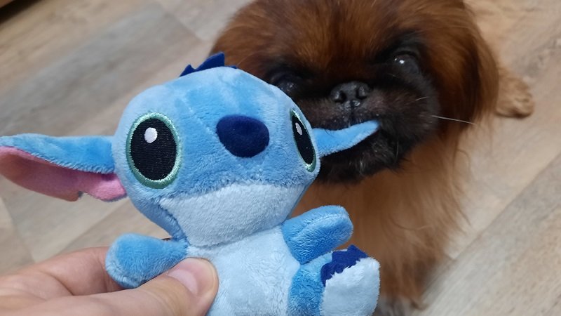 В нашей семье уже Дед Мороз уже начал приносить детям подарки. Идёт предновогодняя неделя. Но Ваня не жадный и дал поиграть пекинесу Дендику игрушку Стича.