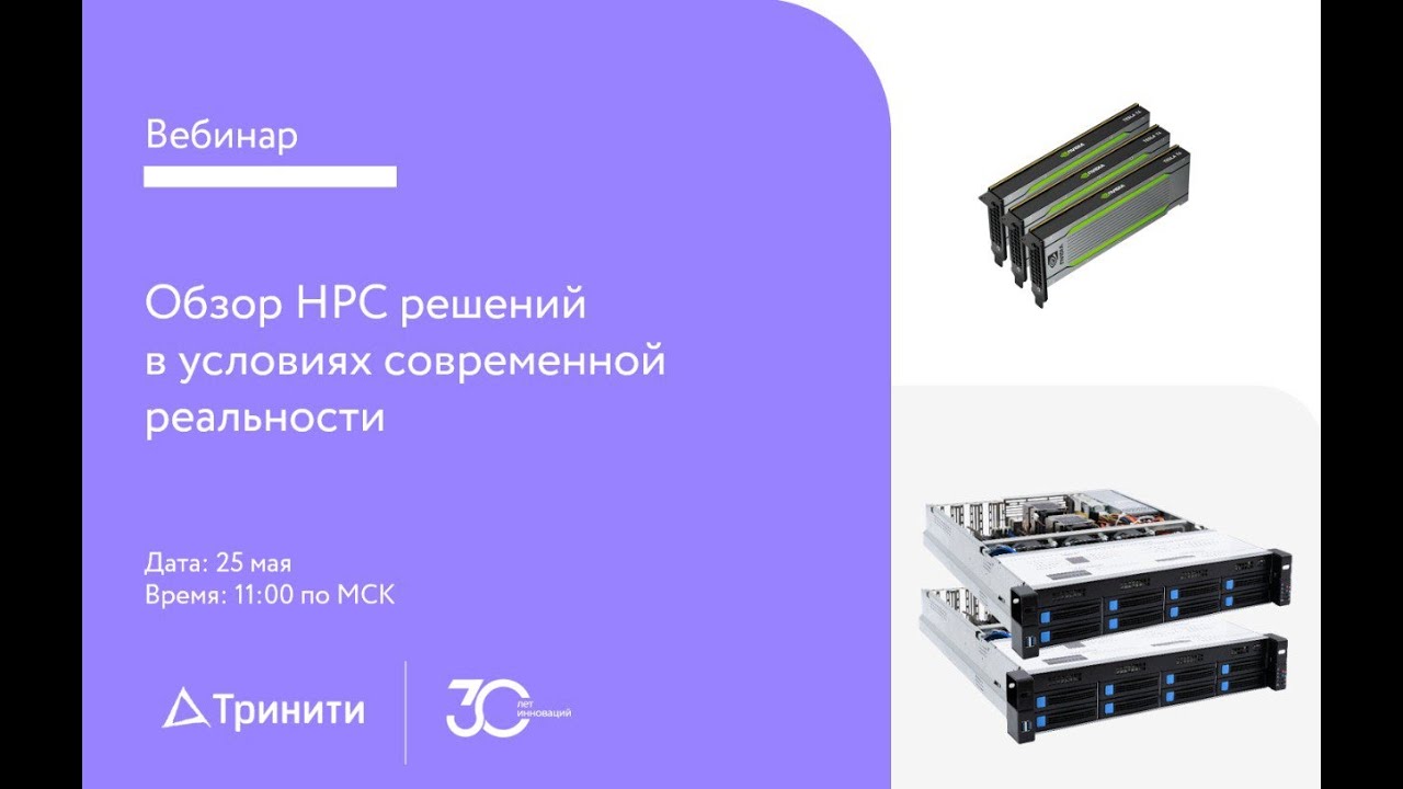 Вебинар Тринити, на котором мы рассказали о HPC решениях и серверах Тринити с GPU ускорителями из реестра Минпромторг. В программе: - Обзор HPC решений. - Серверы Тринити с GPU из реестра Минпромторг. - Ответы на вопросы. Спикеры: - Королёва Евгения, Директор департамента продаж УрФО, Сибирь и Дальний Восток, Тринити - Глинских Сергей, Менеджер проектов HPC, Тринити