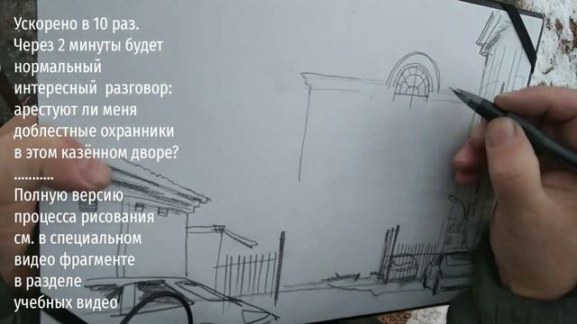 ПРОгулки художника по Иркутску 16 ноября 2022 г. (1) ... Капельница, кардиограмма, три укола и ... три рисунка за день. Но про них отдельно, а пока изо-фото-видео хроники дня. 00:30 Секретный особо охраняемый закуток и красивые фасады во дворе на углу Тимирязева и Чехова. 06:00 Я начал второй рисунок с этого же места и тут, наконец, произошло ожидаемое! Рисующий человек вызывает у чиновного народа особые подозрения! Даже хуже, чем с фотокамерой. Ну, вот, я дорисовался: не прошло и пять минут, ко мне подошёл охранник! Строго, но вежливо спросил: — Вы художник? — Нет, я шпион — глупо ответил я. ... Как объяснил военный (в камуфляже, бронежилете, при оружии): встревоженные сотрудники здания Арбитражного Суда послали его, подозревая что я переписываю номера их машин и потому, что "сейчас всё минируют"! Но рисовать позволил. А на крыльце здания стоял и наблюдал за нами ещё один охранник. Всё равно, стало противно и я ретировался...