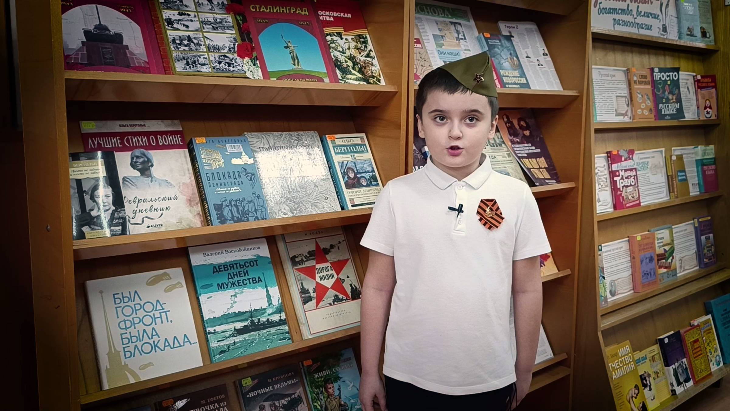 Юный читатель Центральной библиотеки Михаил Калашников принимает участие в акции «Мы о войне стихами говорим». Михаил читает стихотворение Александра Прокофьева «Над синей Невой»