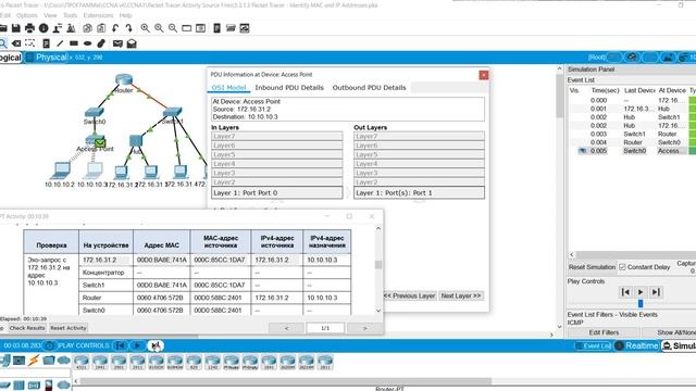 Выполнение лабораторной работы "5.3.1.3 Packet Tracer - Identify MAC and IP Addresses" из курса CCNA1v6
