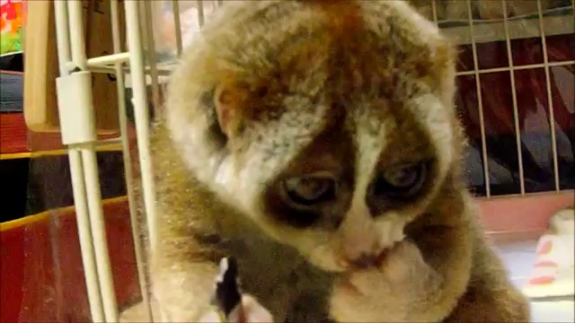 Милое животное медленно кушает рисовый шарик