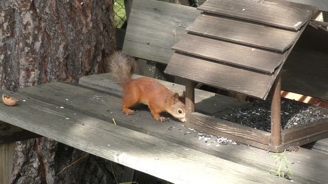 Летом у белок еды хватает, приходят по привычке. Вдруг что-то вкусненькое дадут. Этот сидел в кормушке и ел семечки. Чтобы его поснимать принесли орешек, но с орешком нужно возиться, а лень, да и не голоден вообщем-то.