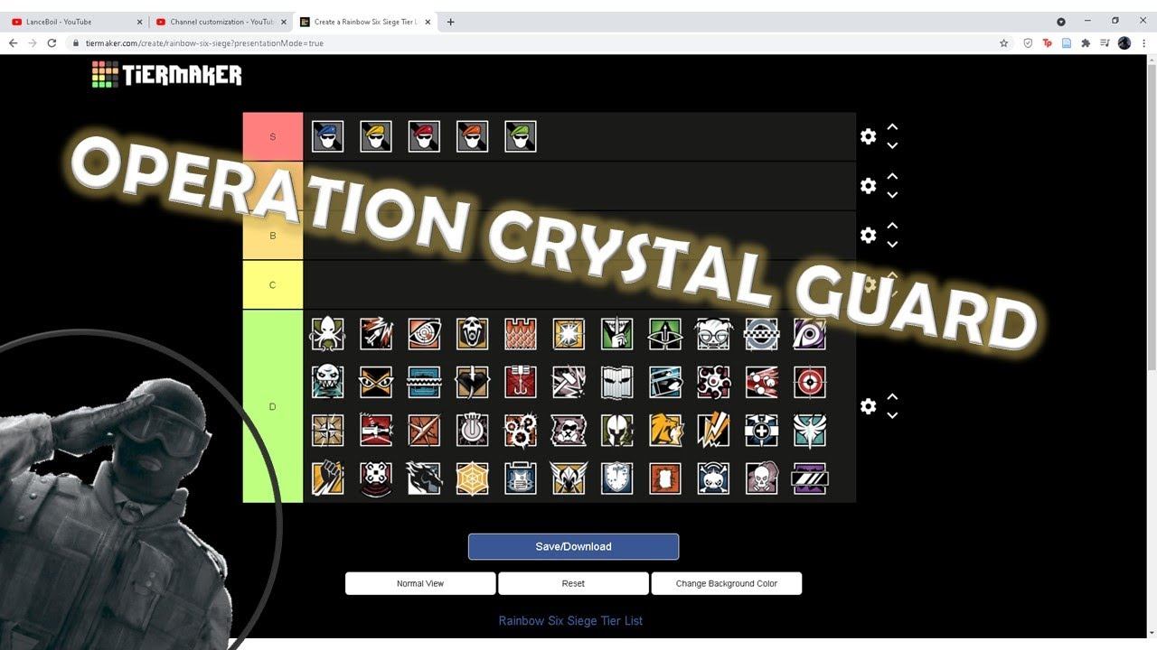 Tom Clancy’s Rainbow Six Siege Operation Crystal Guard Tier List. This tier list is aimed for mid to high ello. Subscribe to keep up on this wonderful Siege content! Comment what you would change about my tier list! Like the video, if you liked the video