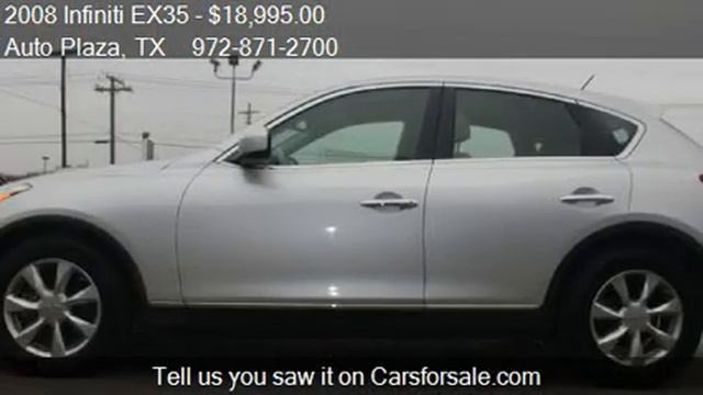 This 2008 Infiniti EX35 EX35 Journey is for sale in Irving, TX 75061 at Auto Plaza. Contact Auto Plaza at www.autoplazatx.com or http://www.carsforsale.com/used_cars_for_sale/dealerinventory.aspx?dealerid=385325 Engine: 6-Cylinder 3.5L V6 DOHC 24V Transmission: 5-Speed Automatic Color: Scarlet Silver Pearl Metallic Mileage: 98365 Contact Auto Plaza 1660 N Belt Line Rd Irving, TX 75061 to test drive this 2008 Infiniti EX35 EX35 Journey today.