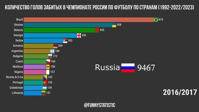 Количество голов забитых в Чемпионате России футболистами из разных стран с сезона 1992 по 2022/2023
