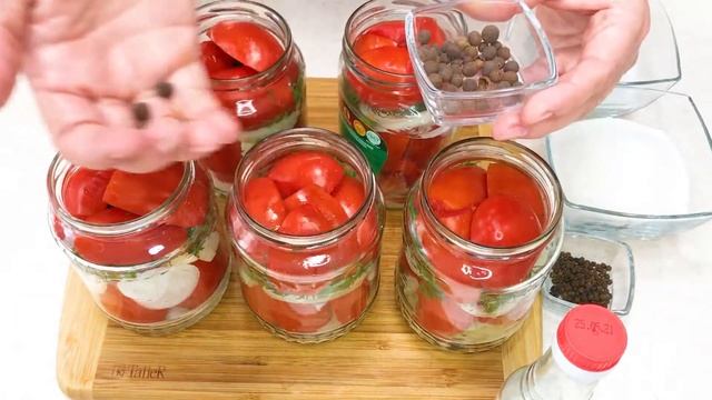 Вкуснейшие Помидорчики Дольками на Зиму!!! Рецепт: НА (0,8 л.) БАНКУ ·помидоры 6 шт. ·чеснок 2 зубчика ·лук 1 головка ·соль 1,5 .ст.л. (без горки) ·сахар 2 ст.л. ( без горки) ·укроп по вкусу ·уксусная эссенция 70% 1 ч.л. (неполная) ·перец чёрный (горошек) 5-6 шт. ·перец душистый (горошек) 3 шт. Заливаем кипятком Стерилизуем 15 минут