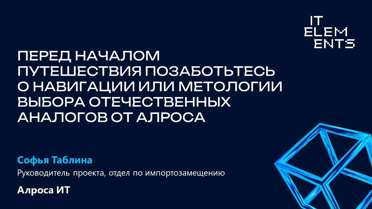 Софья Таблина, руководитель проекта, отдел отдел по импортозамещению «АЛРОСА ИТ» • Подход к импортозамещению АК «АЛРОСА» (ПАО) • Методология выбора решения • Ожидания и реальность — на что влиять вместе? 00:28 Захватывающие факты об «Алроса» 02:39 Подход к импортозамещению 05:27 Ожидание и реальность: развитие рынка 08:20 Ожидание и реальность: развитие экспертизы 10:05 Квардрант «Алроса». Инвестиции в развитие продуктов 13:33 Выбор решения: методология 16:14 Выбор решения: детали 19:05 Вместе мы — сила!